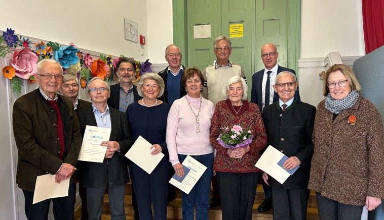 (v.l.) Vorsitzender des Schulaufsichtsverbands Jürgen Heiß, Vorsitzender des Oberbayerischen Schulaufsichtsverbands Franz Mitterer, Johanna Schlederer, Ltd. RSchD 55 Jahre Verbandszugehörigkeit, Gertrud Gruber, Pensionistenvertreterin Obb