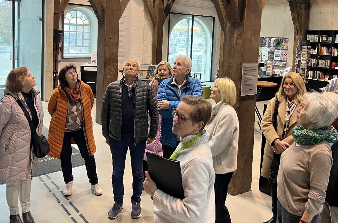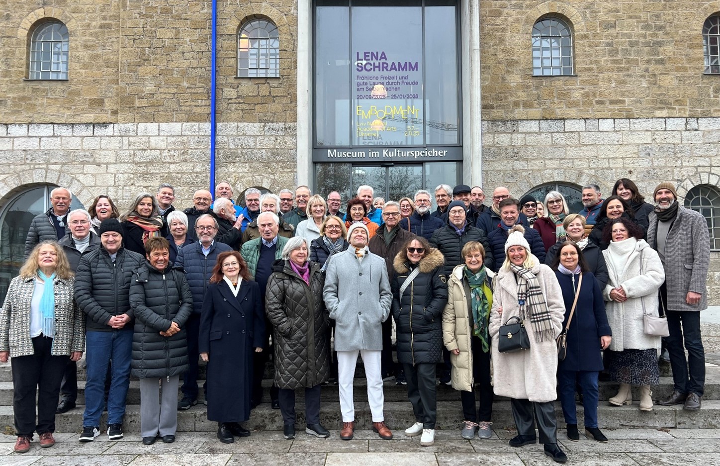 Das Wintertreffen 2025 führte insgesamt 60 aktive und pensionierte Schulaufsichtsbeamte aus Unterfranken nach Würzburg. Der Nachmittag begann mit einer Führung durch den Kulturspeicher Würzburg. Hier wurden zwei Führungen zur Geschichte des Kulturspeichers und den verschiedenen Ausstellungen durch fachkundige Gästeführer angeboten. Der ehemalige Getreidespeicher wurde umfangreich um- und ausgebaut und wird seit 2002 als Museum und Veranstaltungsort genutzt. Besonders interessant war zu erfahren, dass die Architektur der Umgebungsgebäude mit den schräg abfallenden Eingangsbereichen zum ehemaligen Kabarett Bockshorn aufgegriffen wurde und die blauen Acrylleuchten an der Außenfassade ein Binärcode zu den Initialen der Sammlung Peter C. Rupperts sind.
